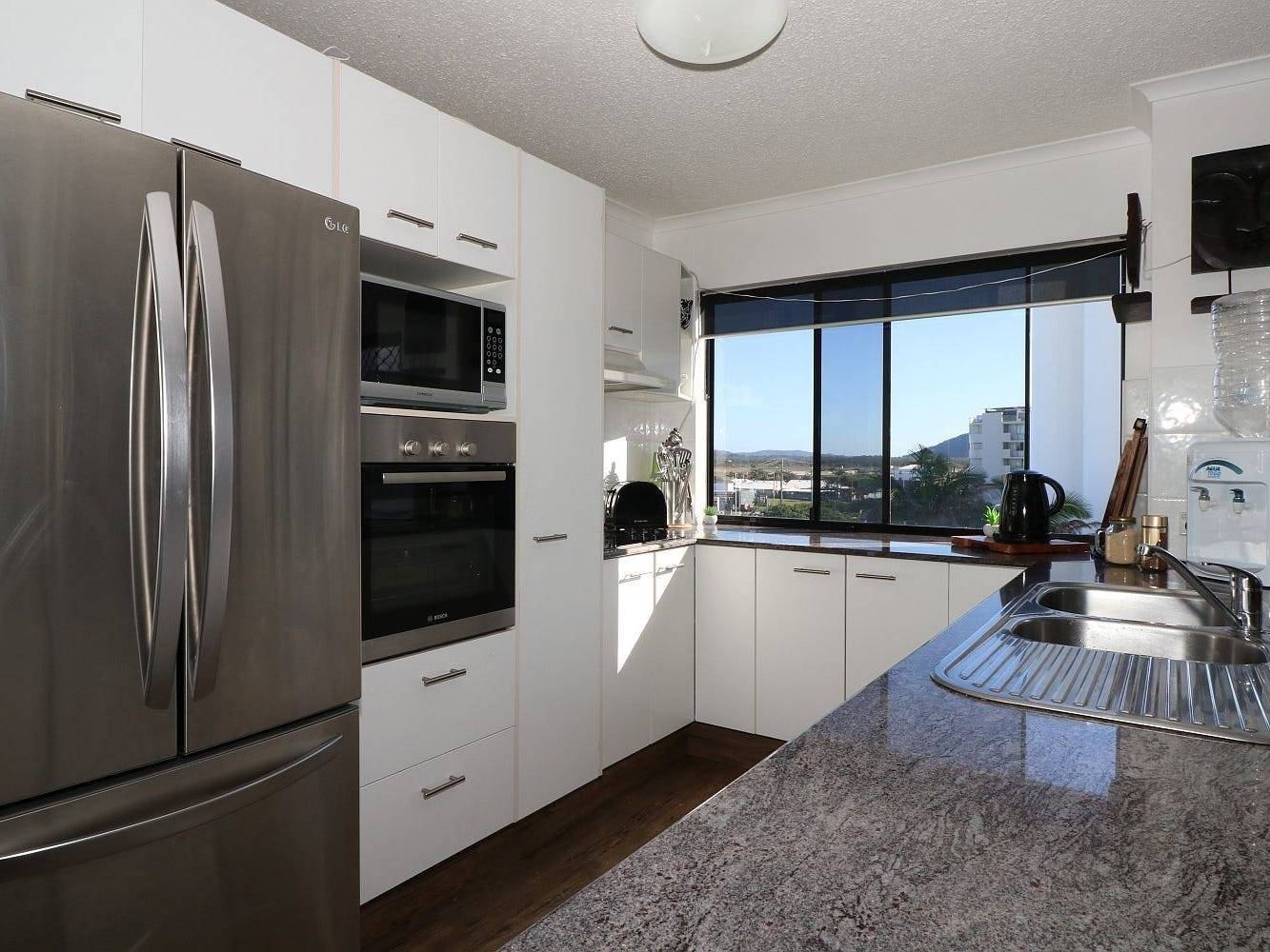 • The well appointed kitchen has loads of storage space, beautiful stone bench tops, & a dishwasher.