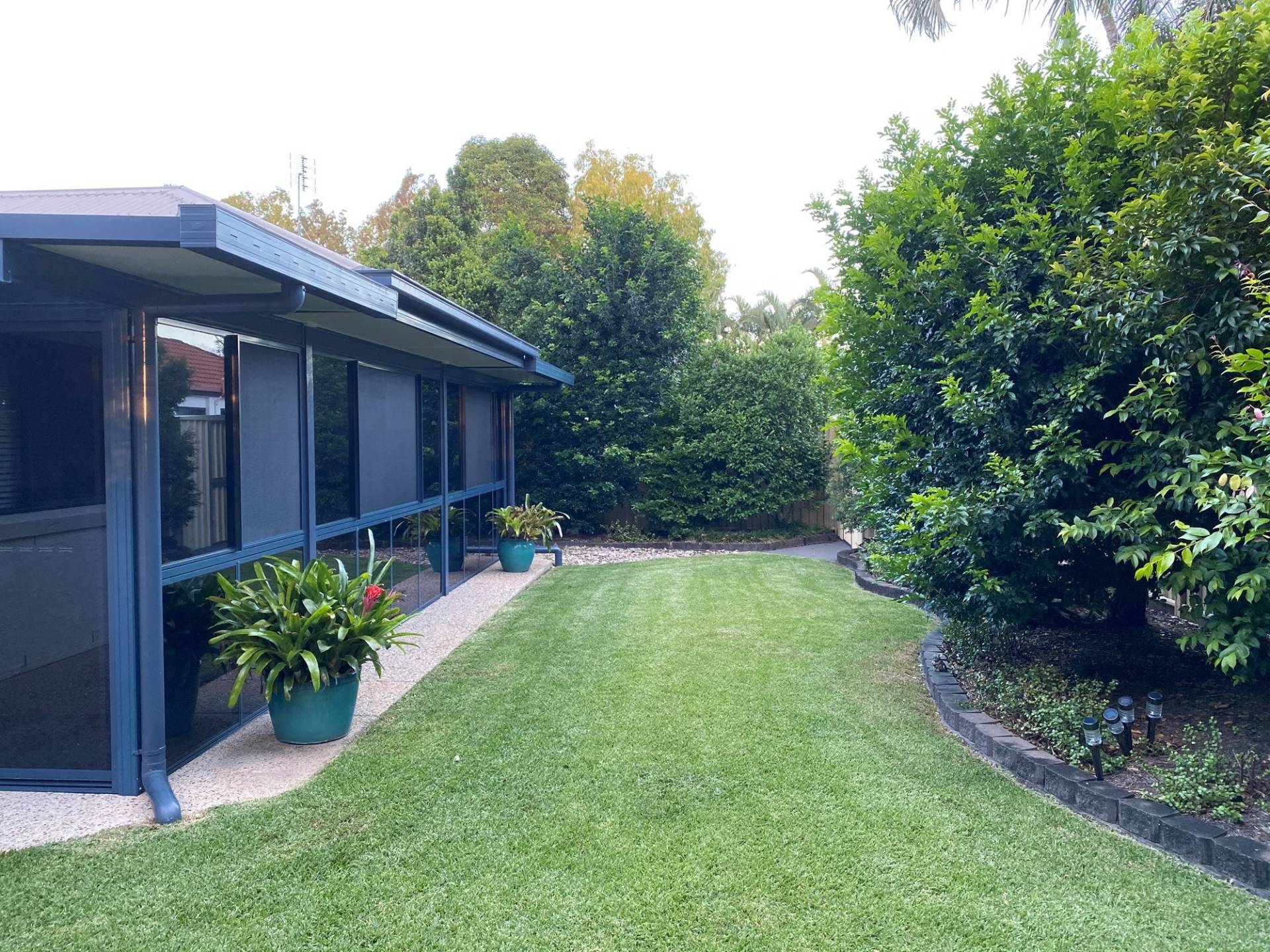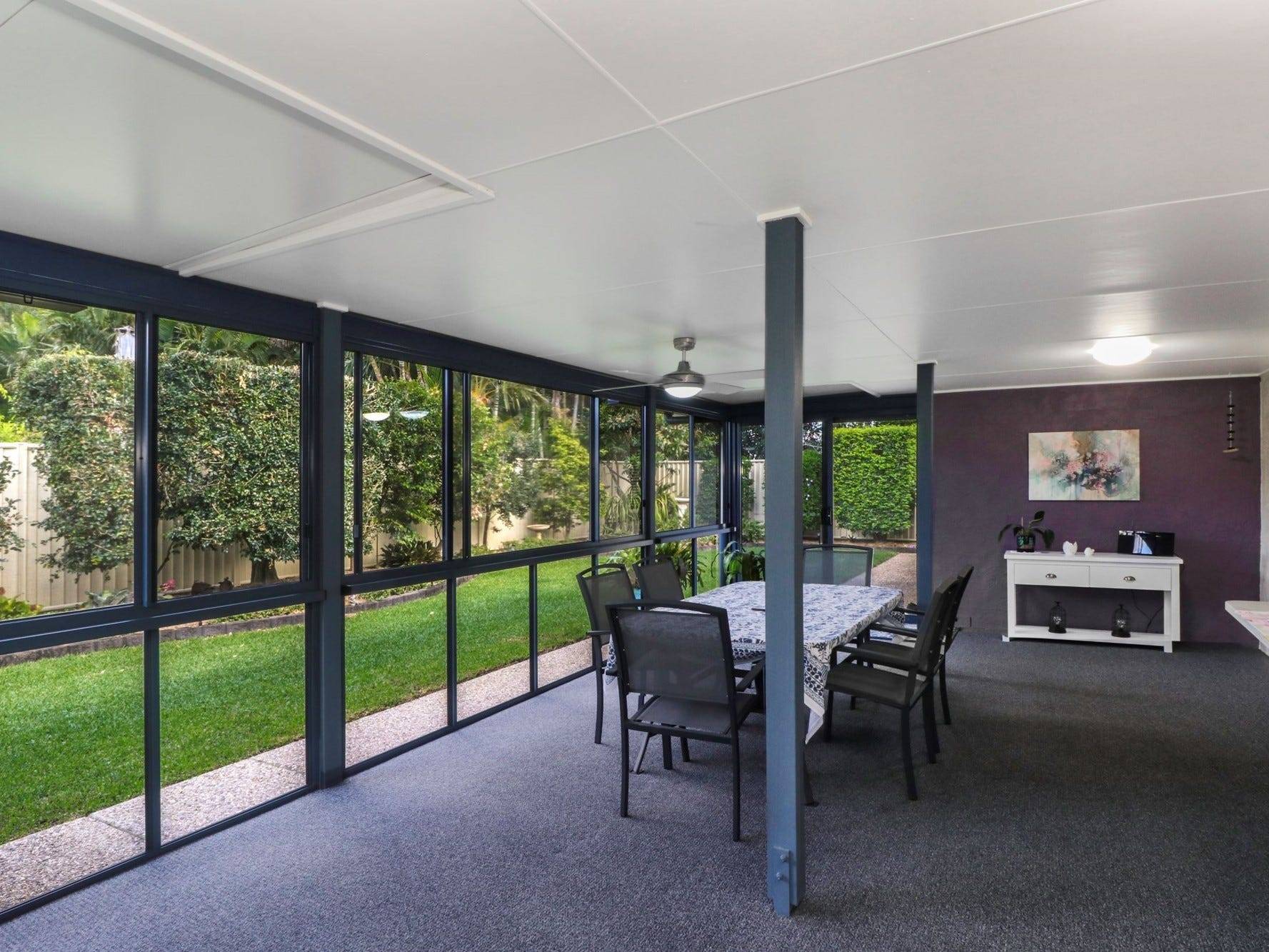 A custom designed over-sized entertainment area features grey glass and ultra-fine insect mesh. Area perfect for large dinner parties, a home gym or children’s playroom.
