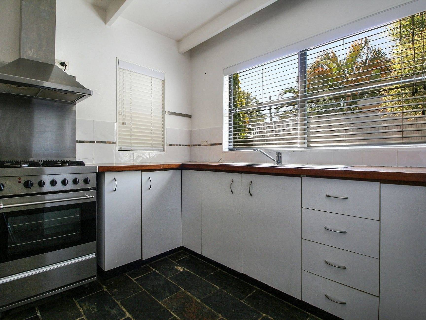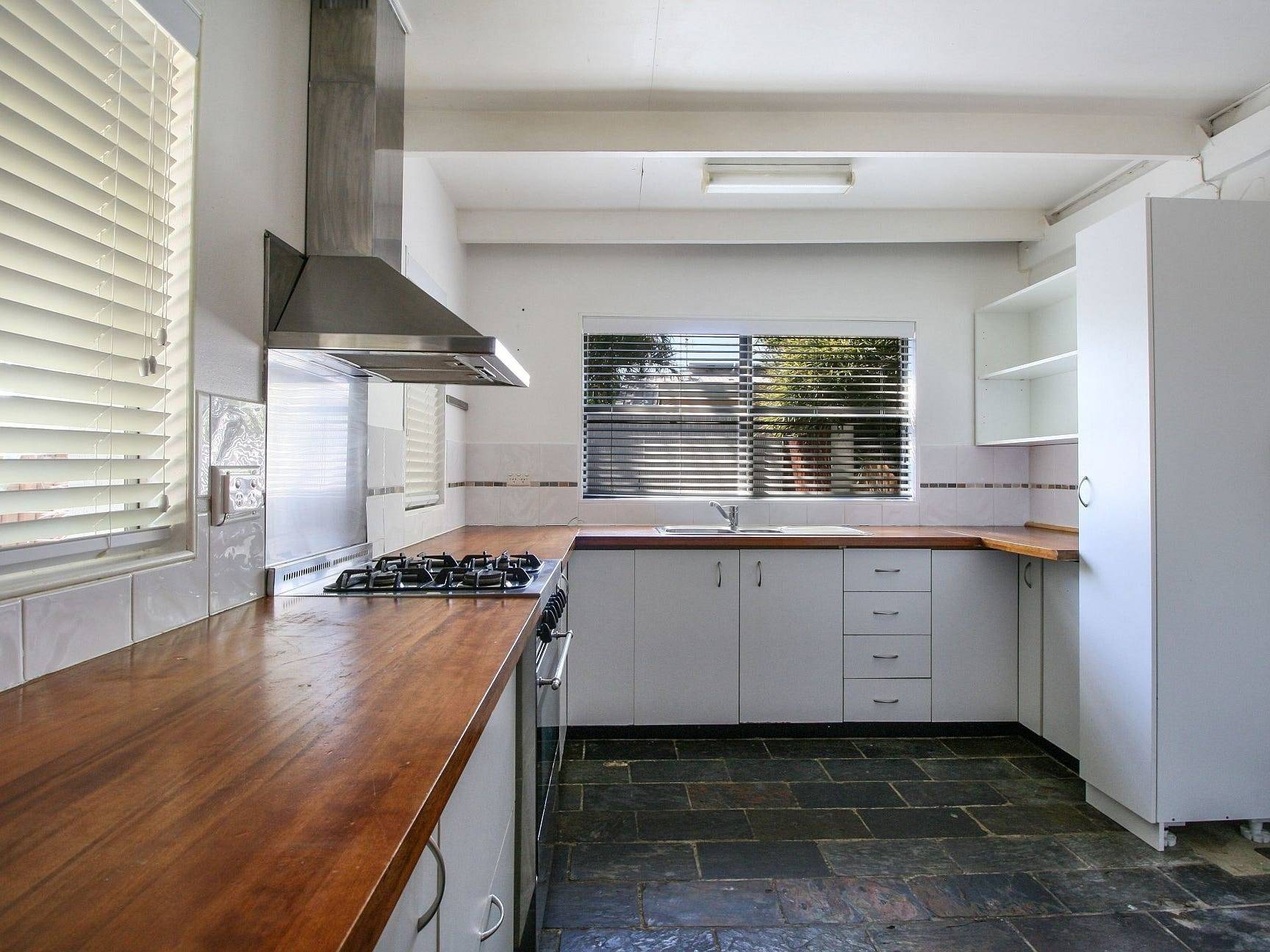 - Kitchen overlooking the front deck, gas stove and plenty of cupboards, timber benches and breakfast bar