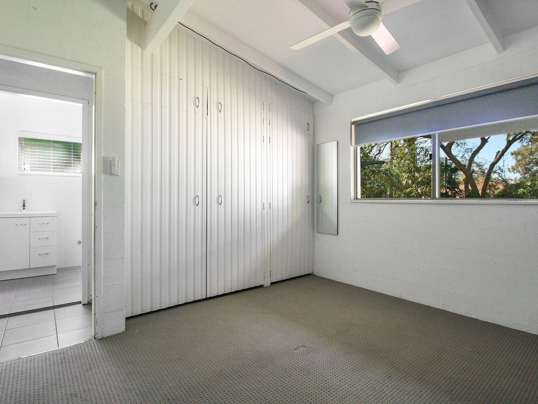 - Main bedroom with a full wall of built-ins, ceiling fan and air-con