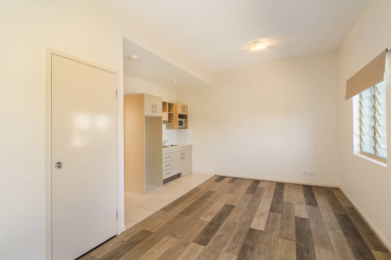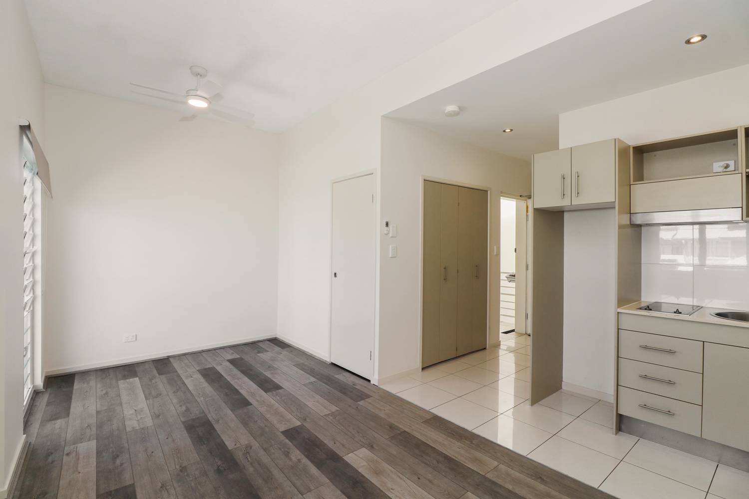 Upon entering, you’ll notice the modern and clean ambiance created by the fresh coat of paint and the newly installed timber look flooring in the living area. The compact kitchen is equipped with a sink and 2 burner hotplates, making meal preparation a breeze.