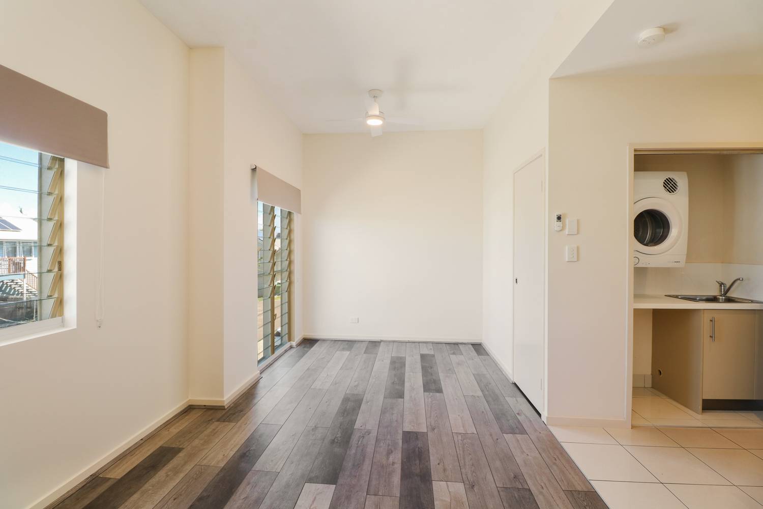 The internal laundry alcove includes a sink and dryer. The open plan bedroom, living and kitchen area is bright and airy with screened louvered windows and a ceiling fan to keep you cool on those hot days.