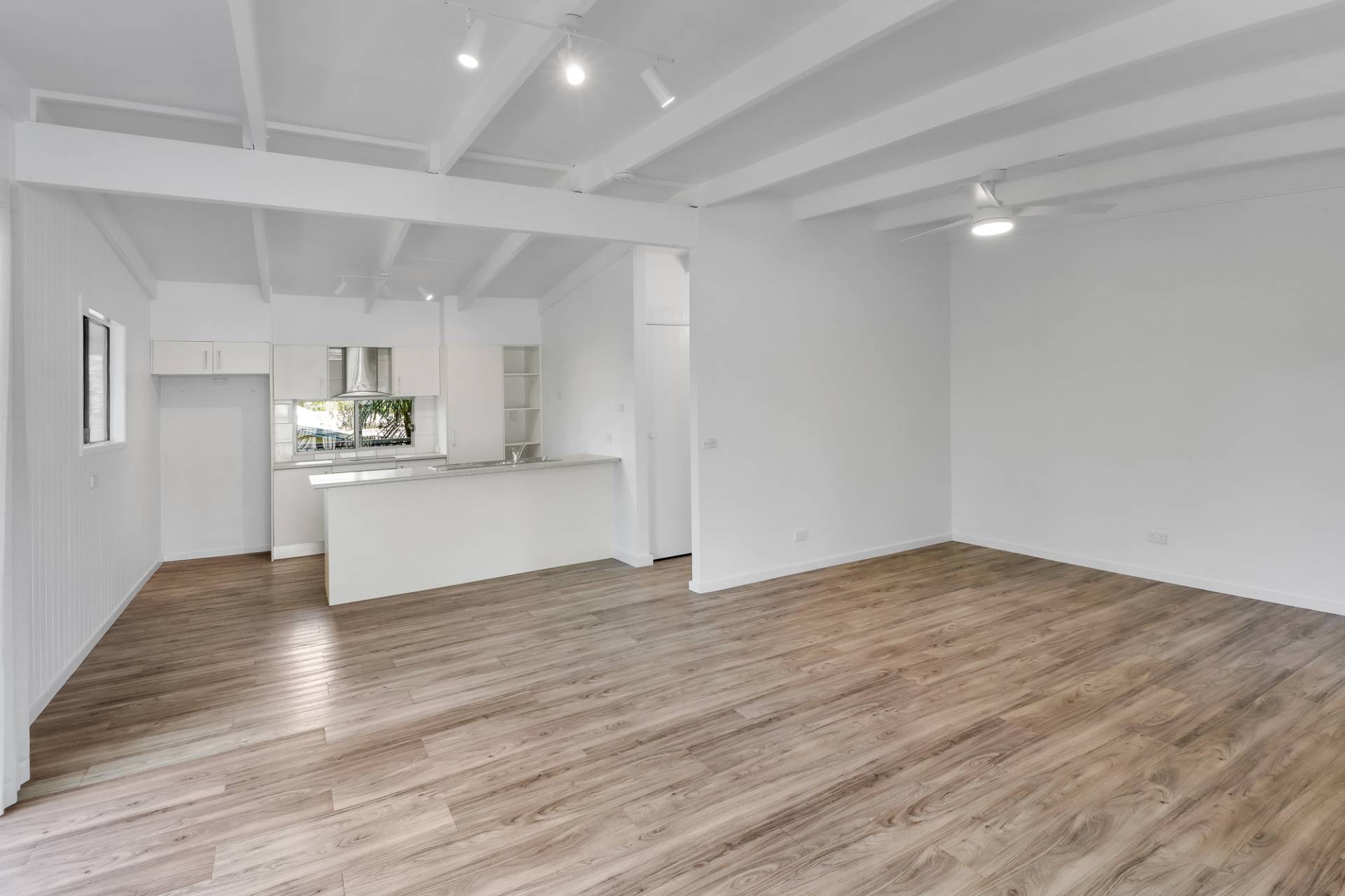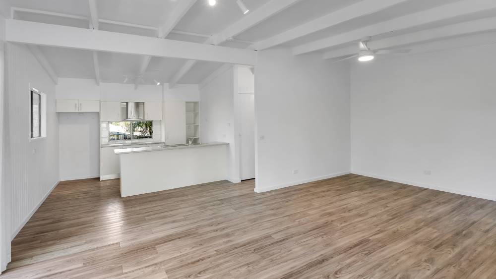 Open plan living, kitchen, bathroom and three bedrooms upstairs.