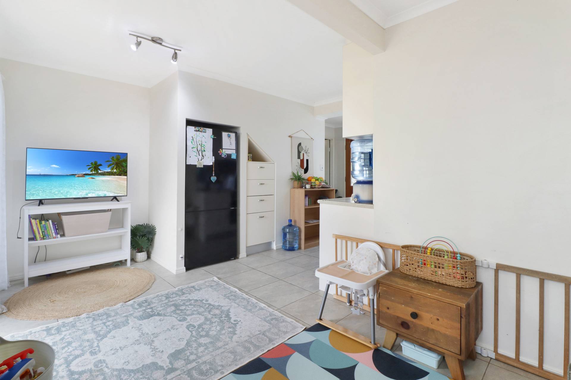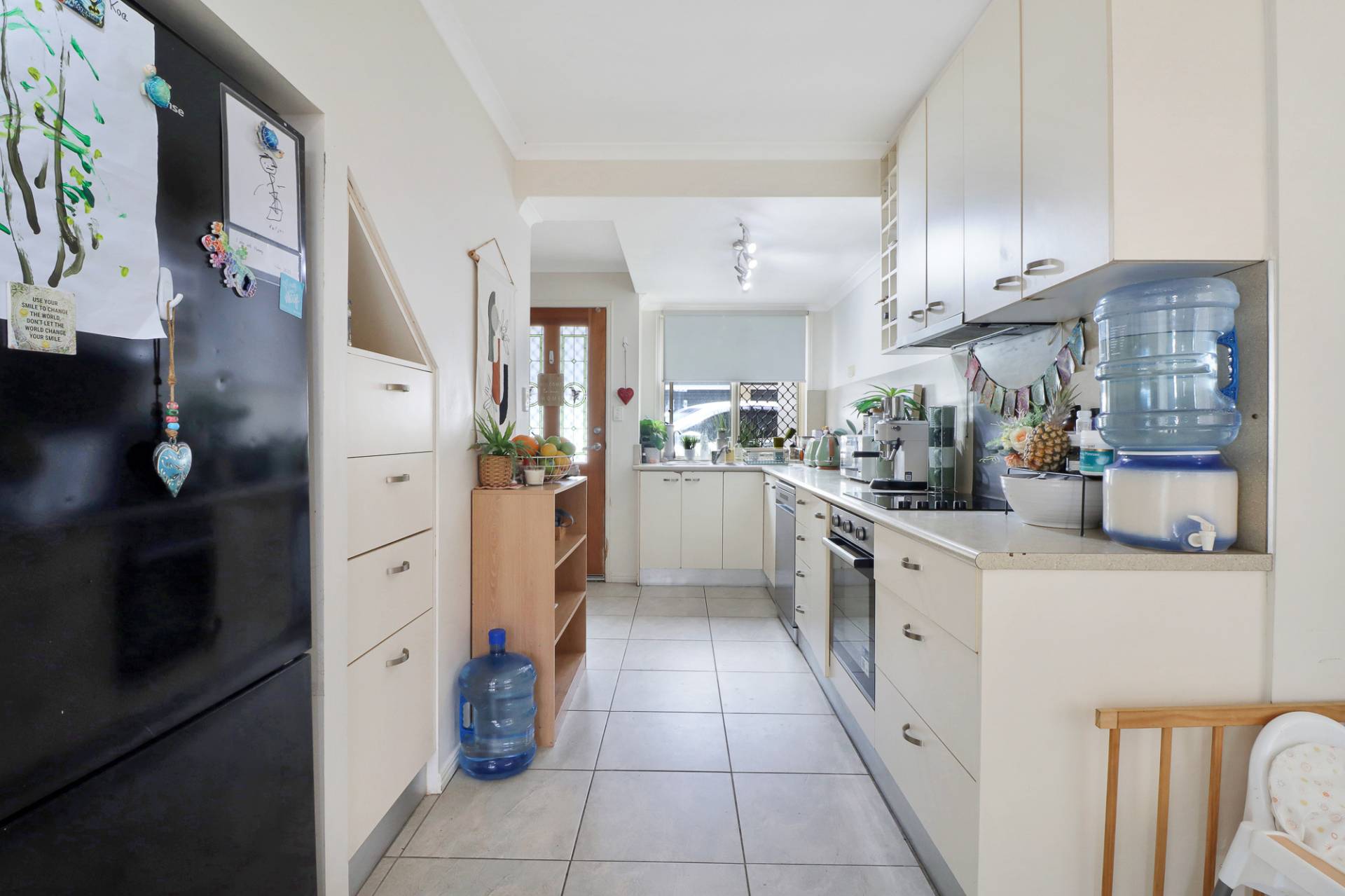 The small complex and cu-de-sac position creates a safe environment for family and pets. The tidal stormwater canal behind means no back neighbours and an enough open space for the sea breeze to flow. Open plan living off the kitchen connects to a large covered outdoor area, and the interior garage is tiled and could double as a second living space or third bedroom when needed. The upstairs main bedroom is unusually large, providing room for additional furniture or even a parents retreat or home office.